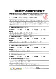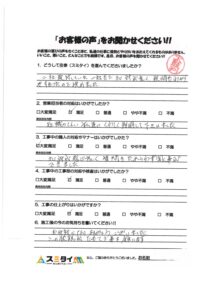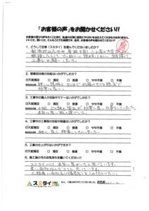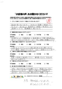 数年前からどこに依頼しようかと思案中、スミタイさんのチラシを見て、お話だけでも聞いてみようと、お店に伺いました。その時に葛貫さんが対応して下さり、お人柄に夫婦で惹かれて、何の迷いも無くお願いする事に決めました。丁寧な説明で、安心してお任せ出来ました。工事関係者の方々も皆さん感じが良くスムーズに工事が終わりました。