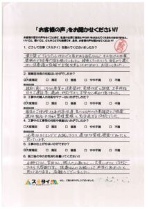 でもこういう工事ってそこが一番大事ですよね何かあった時の対応力 よかったと思います星がひとつかけたのは営業担当と打ち合わせした事が現場監督につたわってないとか少しスムーズにいかないと言う事があったと言う事かな