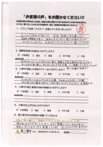 数年前からどこに依頼しようかと思案中、スミタイさんのチラシを見て、お話だけでも聞いてみようと、お店に伺いました。その時に葛貫さんが対応して下さり、お人柄に夫婦で惹かれて、何の迷いも無くお願いする事に決めました。丁寧な説明で、安心してお任せ出来ました。工事関係者の方々も皆さん感じが良くスムーズに工事が終わりました。