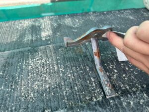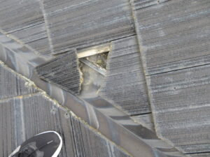 スレート屋根や金属屋根の棟部分に使われる棟板金が浮いていたり、釘が抜けかかっている場合、台風や強風で部材が外れてしまうリスクがあります。