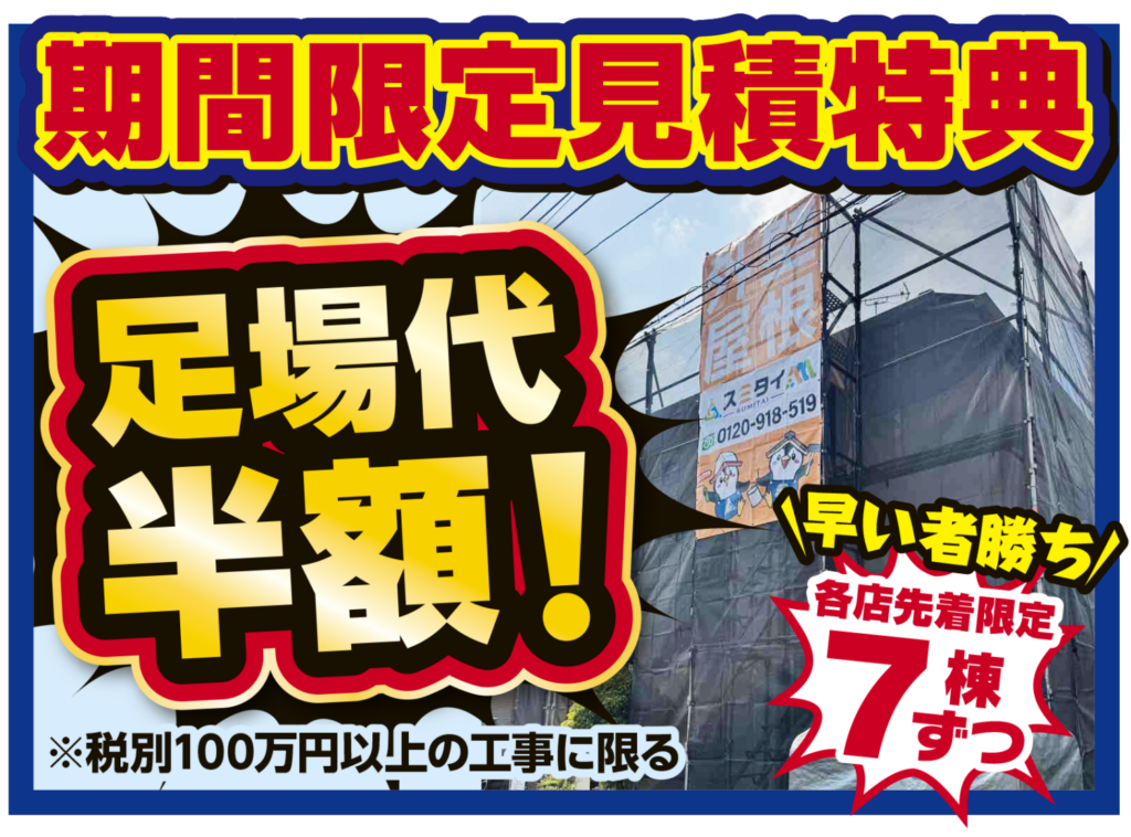 ただいまスミタイでは、期間限定お見積り特典として足場代半額!にてお見積りご提案させていただきます。