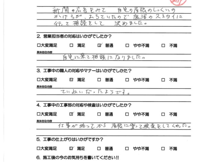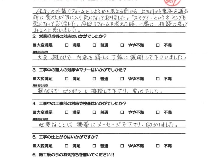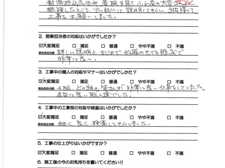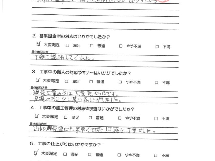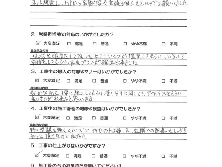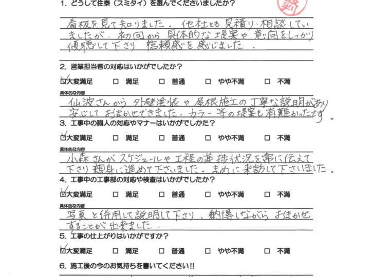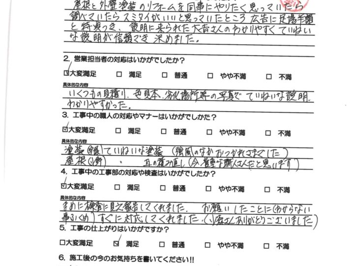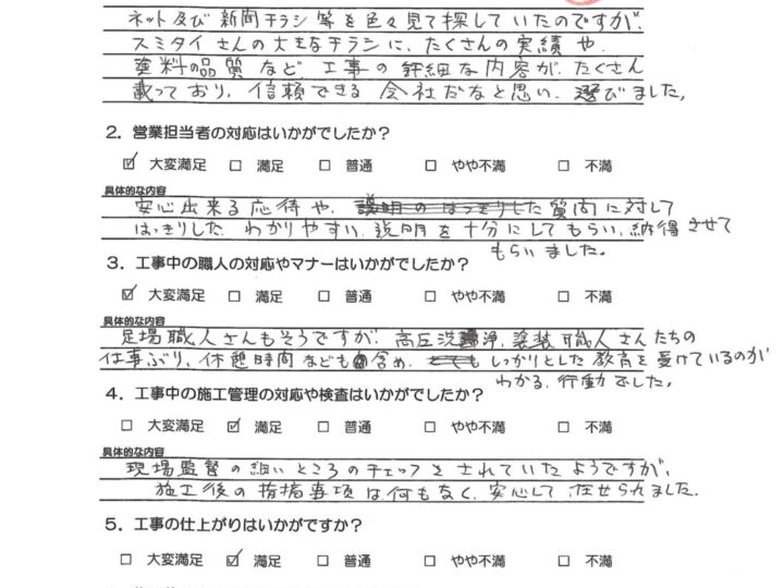 お客様の本当の満足は何なのか?を考えたときに、“外装劣化診断士などの専門スタッフによる外壁屋根の適正診断を行い、それに伴う最適なご提案と高品質施工をご提供し、さらには引き渡し後のアフターフォローなど全てにおいて自社一貫管理体制のもとでお客様にサービスをご提供することである”と私は考えます。