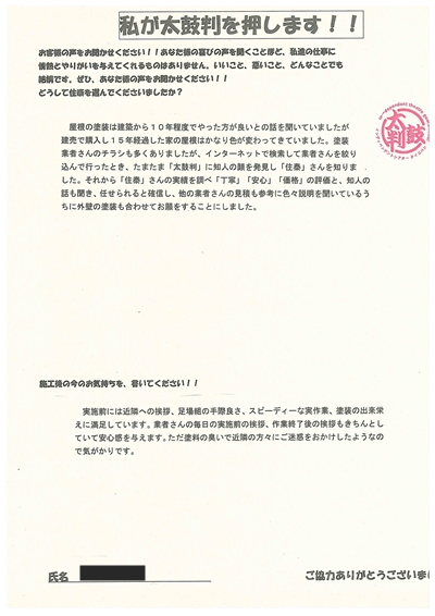 お客様の本当の満足は何なのか?を考えたときに、“外装劣化診断士などの専門スタッフによる外壁屋根の適正診断を行い、それに伴う最適なご提案と高品質施工をご提供し、さらには引き渡し後のアフターフォローなど全てにおいて自社一貫管理体制のもとでお客様にサービスをご提供することである”と私は考えます。