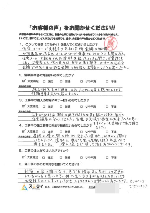 住宅メーカーで見積もりを取った所、金額に納得が出来なかった為ホームページで住泰さんの口コミを読みました。住宅メーカーで勧められた塗料を扱っていると聞き、お電話しました。お電話した次の日には、自宅に来ていただきメーカーの法外な金額ではなく良心的な金額に納得しお願いしようと思いました。