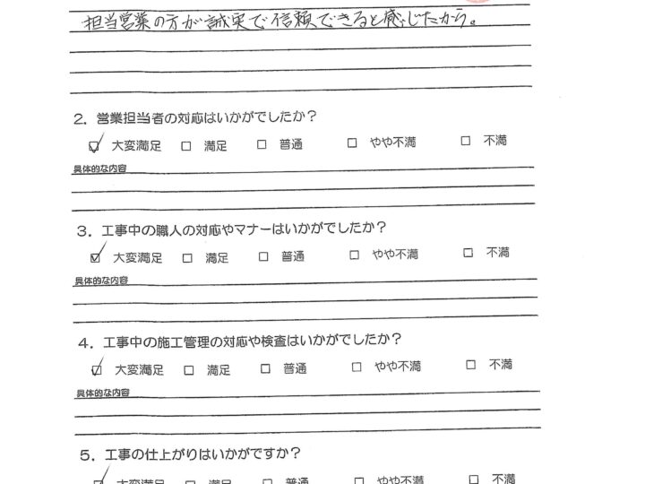 お客様の本当の満足は何なのか?を考えたときに、“外装劣化診断士などの専門スタッフによる外壁屋根の適正診断を行い、それに伴う最適なご提案と高品質施工をご提供し、さらには引き渡し後のアフターフォローなど全てにおいて自社一貫管理体制のもとでお客様にサービスをご提供することである”と私は考えます。
