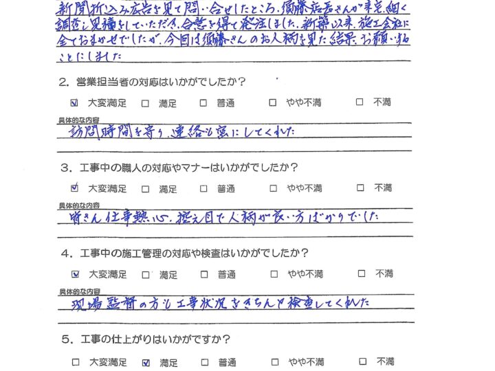 お客様の本当の満足は何なのか?を考えたときに、“外装劣化診断士などの専門スタッフによる外壁屋根の適正診断を行い、それに伴う最適なご提案と高品質施工をご提供し、さらには引き渡し後のアフターフォローなど全てにおいて自社一貫管理体制のもとでお客様にサービスをご提供することである”と私は考えます。