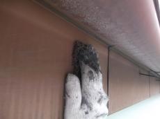 | 破風部も塗料が良く密着するよう、ケレンをしていきます。 | 破風部の下塗りです。 | ガレージの鉄柱部分同様、上塗りをしていきます。 |