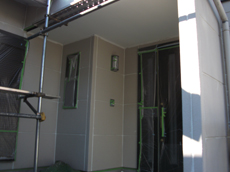 | 軒天部分の下塗りが完了しました。 | 軒天部分の塗装が完了しました。とても綺麗になりましたね。 | 外壁の上塗りをしていきます。写真は1度目です。 |