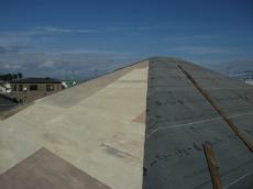 | 9月の台風で板金棟部分が飛ばされました。 | 三つ又部分下地も傷んでいますし屋根全体も劣化が激しいので屋根カバー工法を提案しました。 | 屋根下地造り構造用合板(コンパネ)張りです。 |