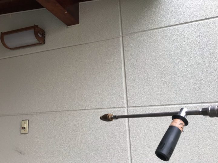 外壁の洗浄作業を行っています。浮いた塗膜やコケ等をきれいに洗い流し、塗装できる状態にします。 -