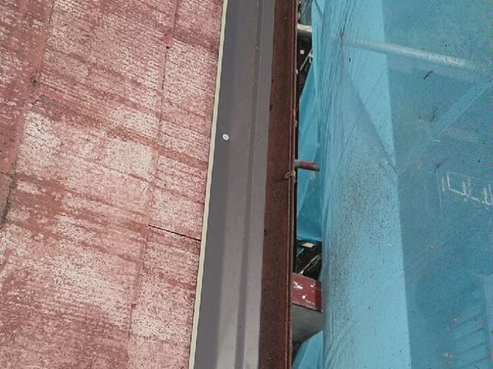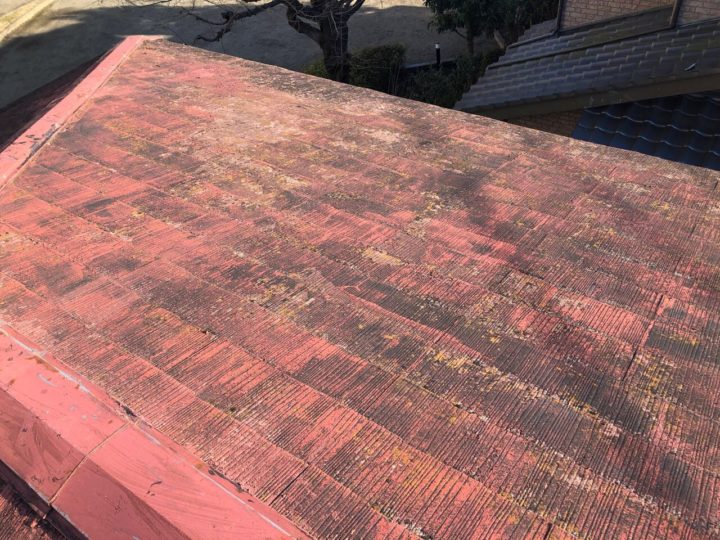 既存屋根材はスレート屋根です。石質の薄い板を使用しているため、劣化や反りがしやすい材料です。 -