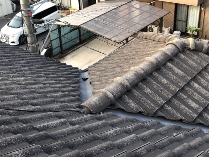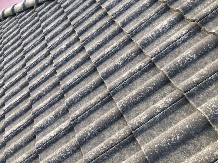 既存の屋根材はセメント瓦です。セメントと川砂を重量比で練り混ぜたモルタルを型に入れて成形したもので、形状により和形、洋型、平型、S型等の種類があります。セメント瓦もカラーベストと同様に、それ本体には防水性がほとんどありません。また塗料で着色するので、どんな色にすることが出来ます。ただ経年劣化によりセメントの成分が取れ瓦が「スカスカ」になり、色落ちしたり表面が劣化してきたりします。 -