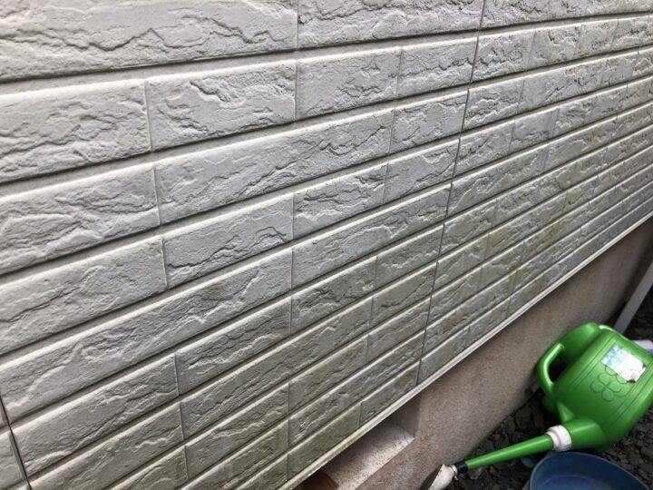 外壁材に一部カビ・コケが発生しているところがあります。低汚染塗料の使用や専用の添加剤を塗料に混ぜることで、カビ・コケの発生を抑制することができます。 -
