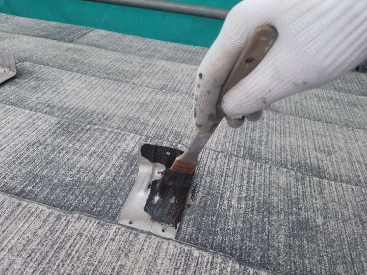 既存屋根材はスレート屋根です。石質の薄い板を使用しているため、劣化や反りがしやすい材料です。 -