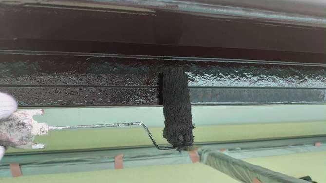 軒天部分のチョーキングが見受けられます。今回、軒天専用塗料を塗布することで素材を長持ちさせることができます。 -