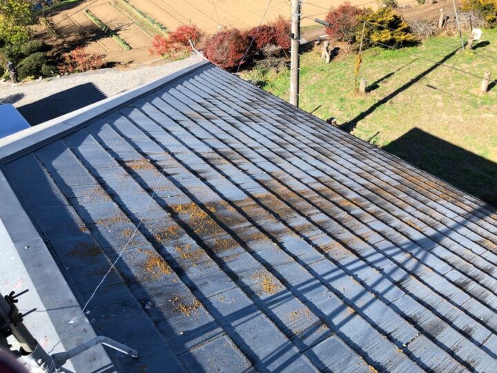 既存屋根材はスレート屋根です。石質の薄い板を使用しているため、劣化や反りがしやすい材料です。 -