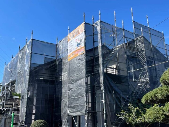 足場の組立・メッシュシートの取付が完了しました。安全且つご近所様への配慮になります。 -