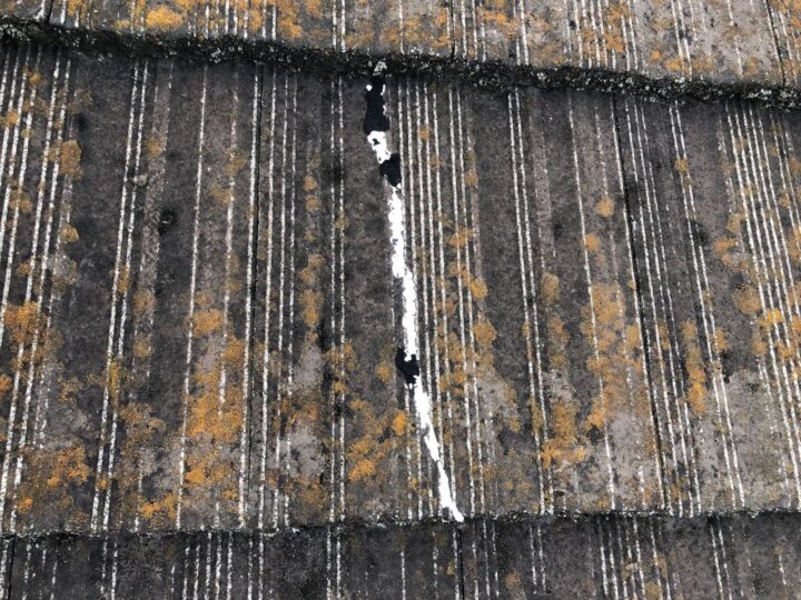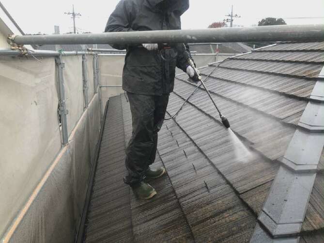 既存屋根材は乾式コンクリート瓦(モニエル瓦)です。スラリー層を高圧洗浄でしっかりと除去をし、専用シーラーを2回塗布し、早期剥離を予防する必要があります。 -