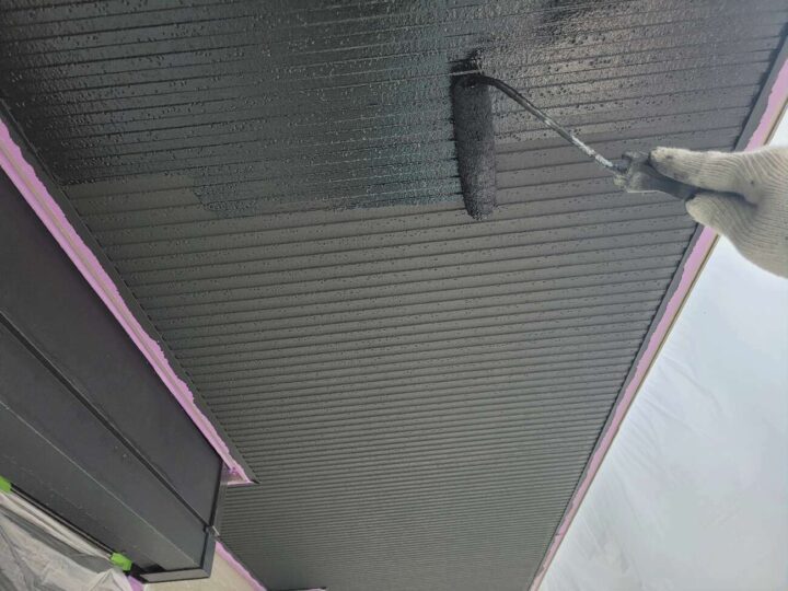 軒天部分の褪色が見受けられます。今回、軒天専用塗料を塗布することで素材を長持ちさせることができます。 -