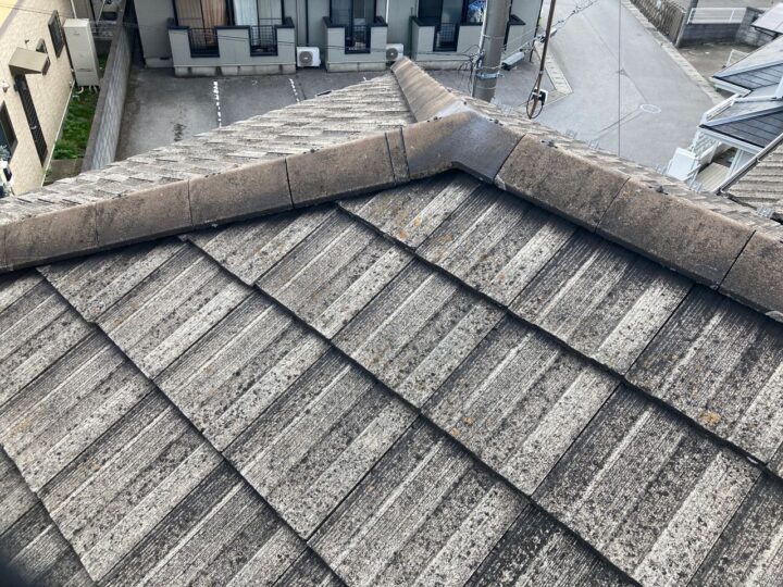 既存屋根材は乾式コンクリート瓦(モニエル瓦)です。スラリー層を高圧洗浄でしっかりと除去をし、専用シーラーを2回塗布し、早期剥離を予防する必要があります。 -
