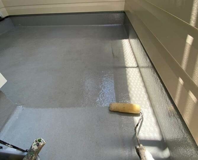 バルコニー床の中塗りを行っています。 -