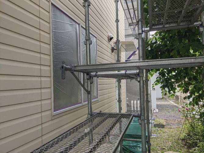 足場の組立・メッシュシートの取付が完了しました。安全且つご近所様への配慮になります。 -