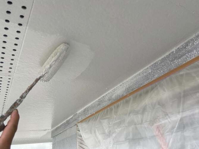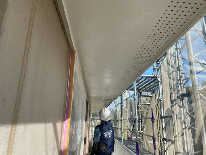 軒天部分に割れ・剥がれが見受けられます。補修し、専用塗料を塗布することを推奨いたします。 -