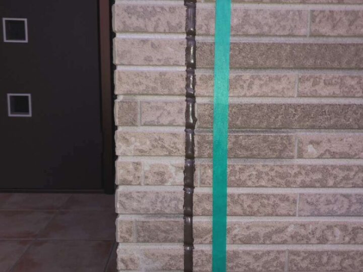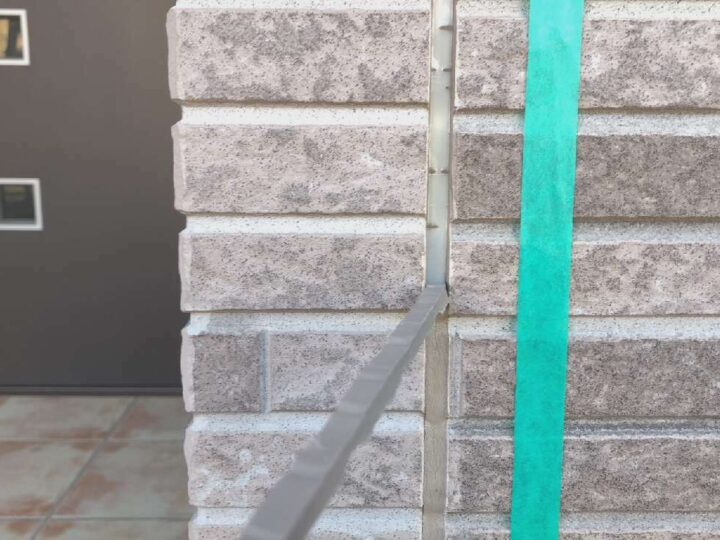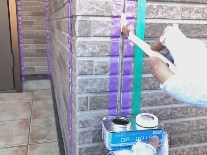 既存のシーリングを撤去し、マスキング・プライマー処理を行っています。 -
