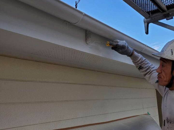 軒天部分の褪色が見受けられます。今回、軒天専用塗料を塗布することで素材を長持ちさせることができます。 -