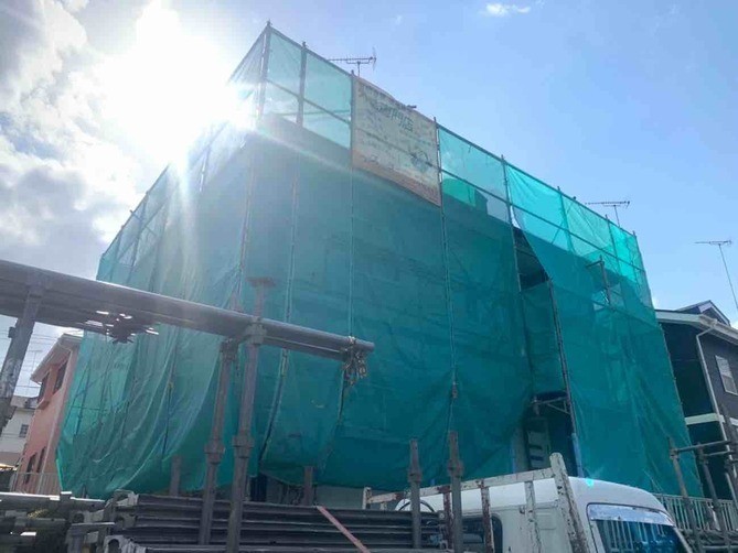 足場の組立・メッシュシートの取付が完了しました。安全且つご近所様への配慮になります。 -