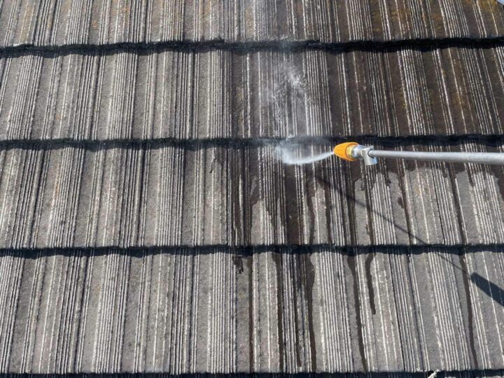 既存屋根材は乾式コンクリート瓦(モニエル瓦)です。スラリー層を高圧洗浄でしっかりと除去をし、専用シーラーを2回塗布し、早期剥離を予防する必要があります。 -
