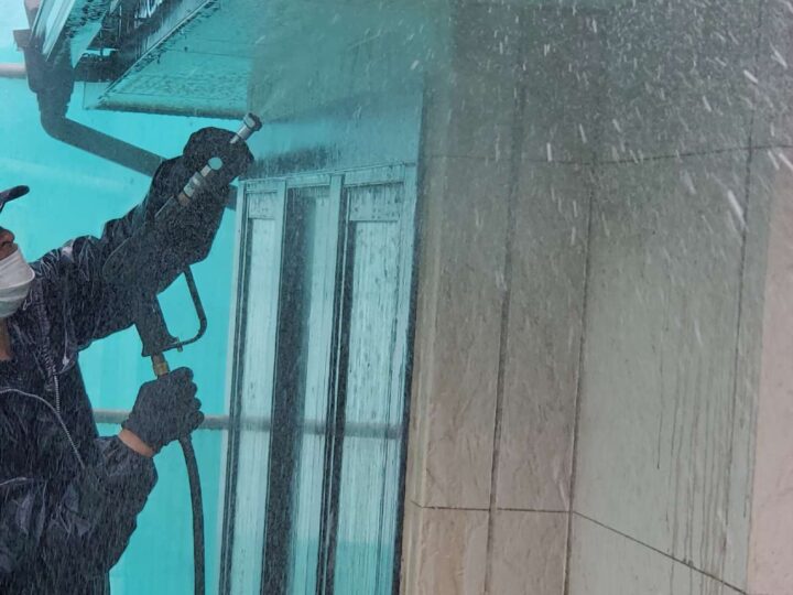 外壁の洗浄作業を行っています。浮いた塗膜やコケ等をきれいに洗い流し、塗装できる状態にします。 -
