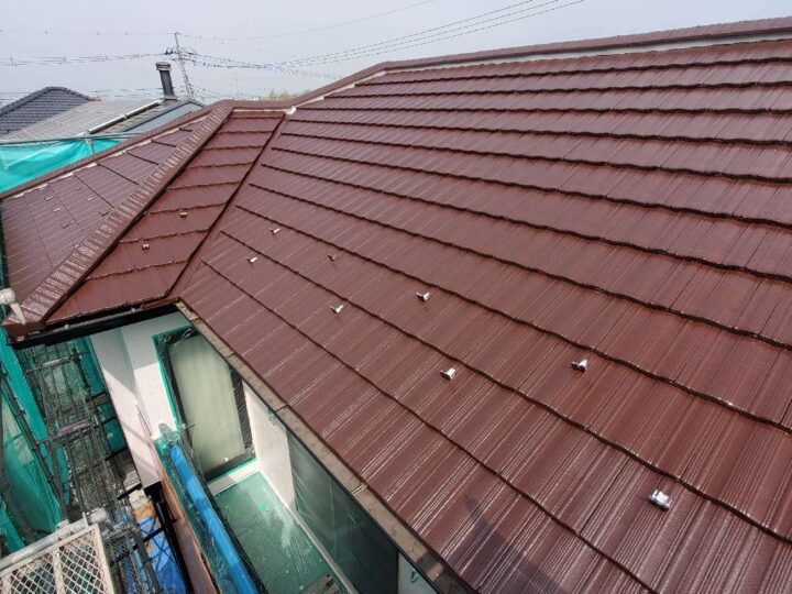 既存屋根材は乾式コンクリート瓦(モニエル瓦)です。スラリー層を高圧洗浄でしっかりと除去をし、専用シーラーを2回塗布し、早期剥離を予防する必要があります。 -