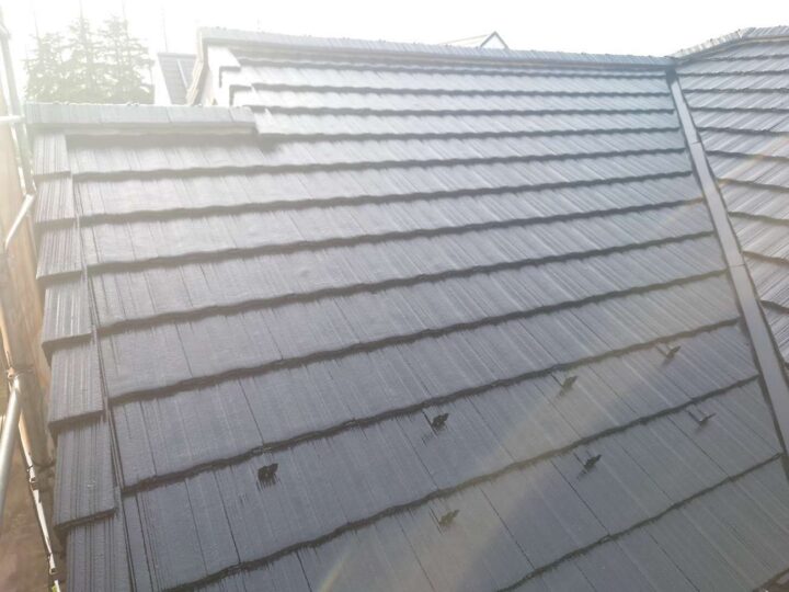 既存屋根材は乾式コンクリート瓦(モニエル瓦)です。スラリー層を高圧洗浄でしっかりと除去をし、専用シーラーを2回塗布し、早期剥離を予防する必要があります。 -