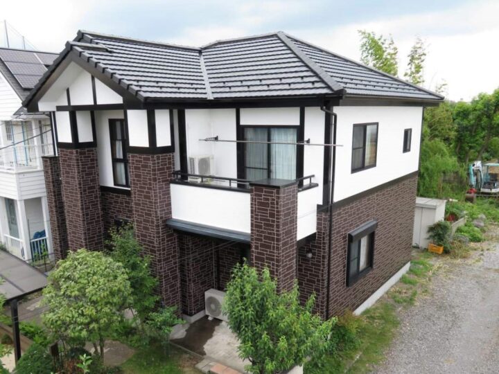 | 使用材料 | 屋根塗装:ジャパンカーボライン㈱ スーパームキコートルーフ カラー:9109 アイボリーブラック 外壁塗装:ジャパンカーボライン㈱ スーパームキコート カラー:9010 クールホワイト/8075 パイオニア(ダブルトーン) |