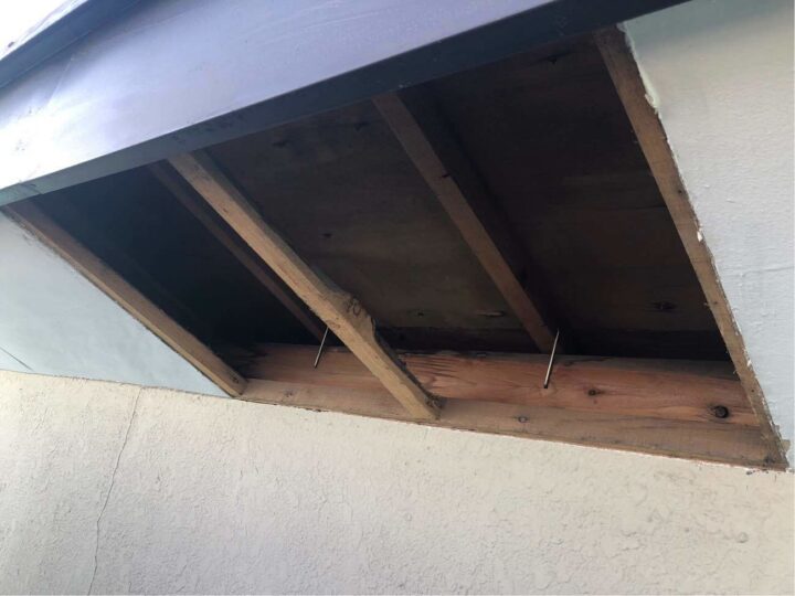棟材戸矢ばれる部分が浮いており、下地の木材が見えている状態です。 -