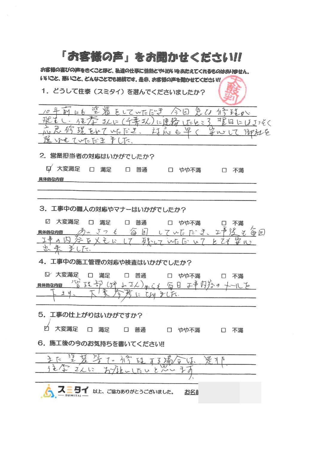 10年前にも塗装をしていただき、今回急な修繕が発生し住泰さん(千葉さん)に連絡したところ、翌日にはさっそく応急修理をしていただき、対応も早く安心して御社を選ばせていただきました。