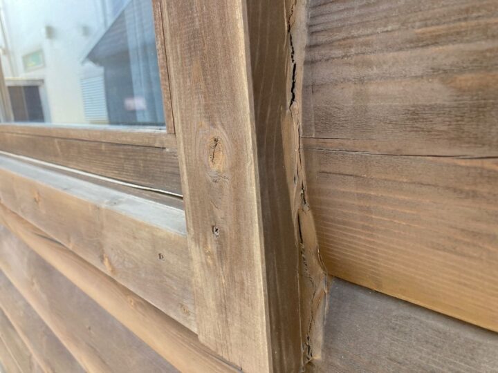 既存外壁材は木製羽目板です。木材は乾燥収縮し割れやすいのが特徴なため、含浸性の木部専用塗料を塗布することを推奨いたします。 -