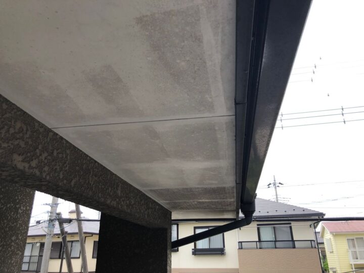 軒天部分にカビが見受けられます。今回、防カビ成分の入った軒天専用塗料を塗布することで素材を長持ちさせることができます。 -
