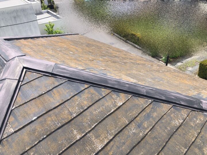 既存屋根材はスレート屋根です。石質の薄い板を使用しているため、劣化や反りがしやすい材料です。 -