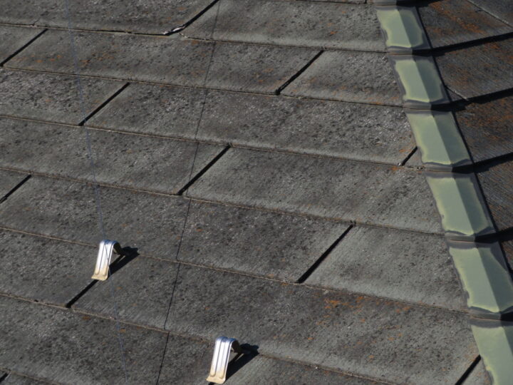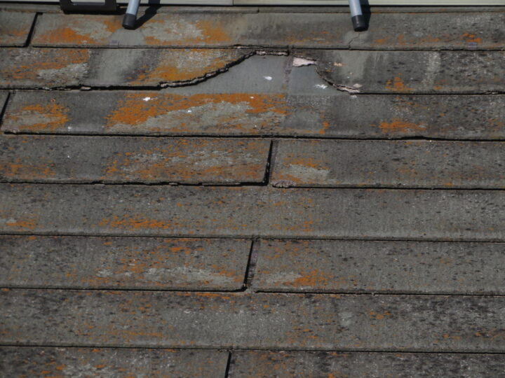 既存屋根材はスレート屋根です。石質の薄い板を使用しているため、劣化や反りがしやすい材料です。グリシェードネオという屋根材でアスベストが入っていない屋根材の中で特に強度が弱く、塗装が出来ない材料です。 -