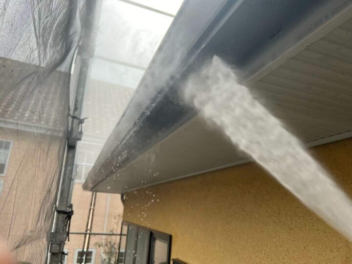 付帯部の洗浄作業を行っています。浮いた塗膜やコケ等をきれいに洗い流し、塗装できる状態にします。 -