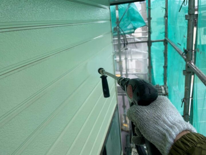 外壁の洗浄作業を行っています。浮いた塗膜やコケ等をきれいに洗い流し、塗装できる状態にします。 -