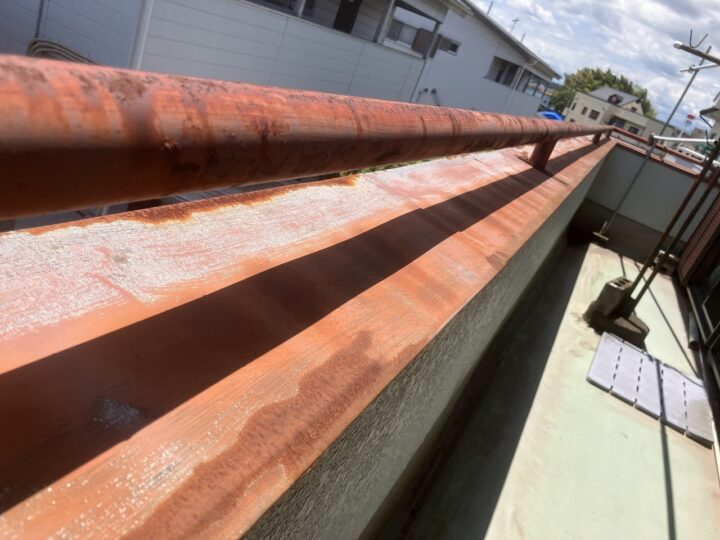 バルコニー笠木と手摺の褪色及びサビが見受けられます。今回、外壁と併せて塗装をすることで、お家を長持ちさせることができます。 -