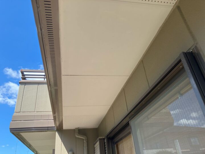 軒天の上塗りを行っています。 -