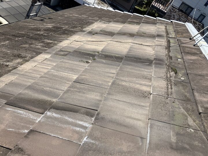 既存屋根材は乾式コンクリート瓦(モニエル瓦)です。スラリー層を高圧洗浄でしっかりと除去をし、専用シーラーを2回塗布し、早期剥離を予防する必要があります。 -