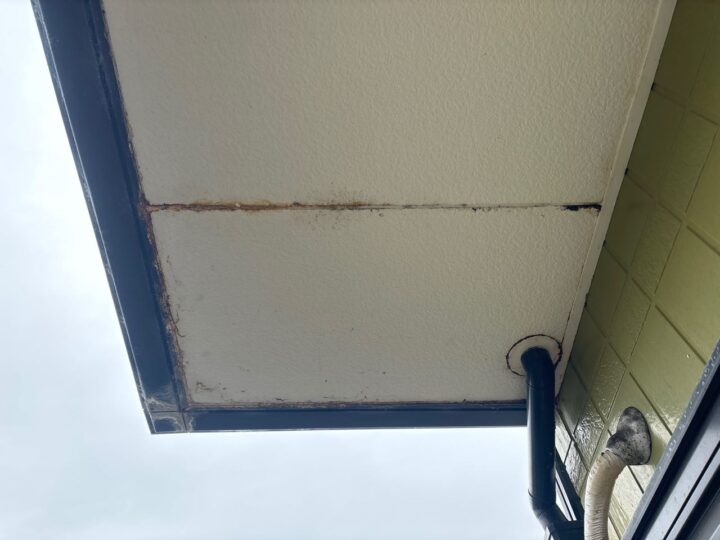 軒天部分に剥がれが見受けられます。今回ベランダ下軒天に関しては交換をし、専用塗料を塗布することを推奨いたします。 -
