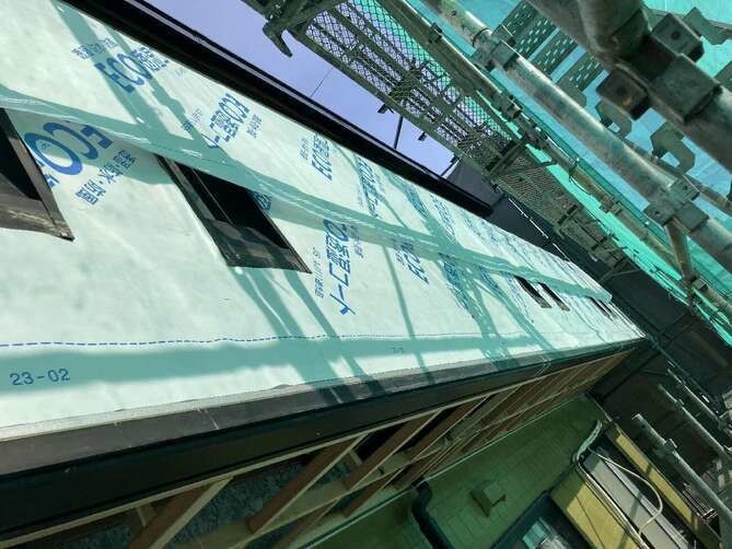 屋根板金部分の下塗り(サビ止め)を行っています。 -