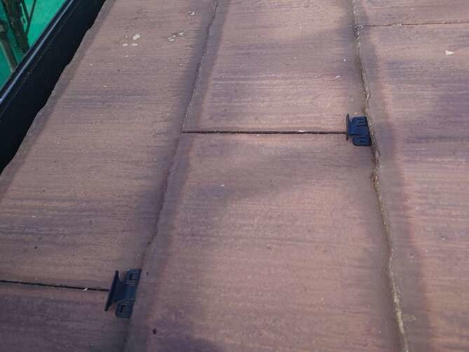 既存屋根材はスレート屋根です。石質の薄い板を使用しているため、劣化や反りがしやすい材料です。 -
