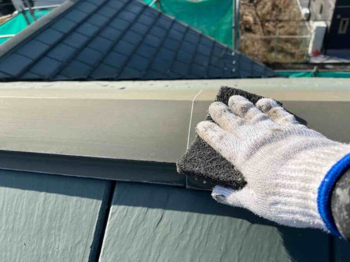 屋根板金部分の下塗り(サビ止め)を行っています。 -